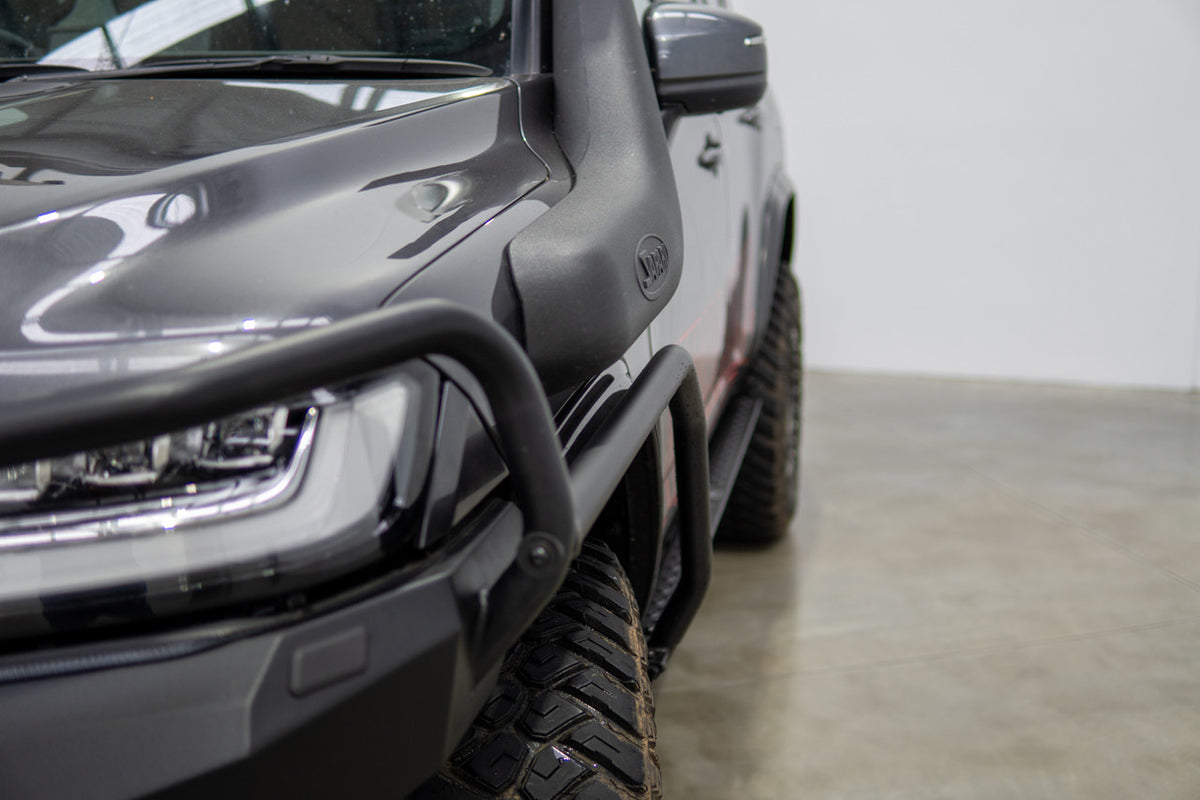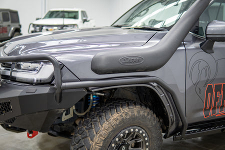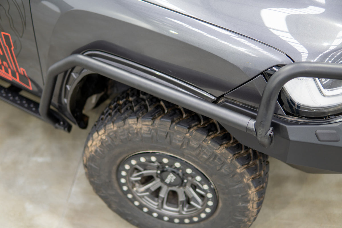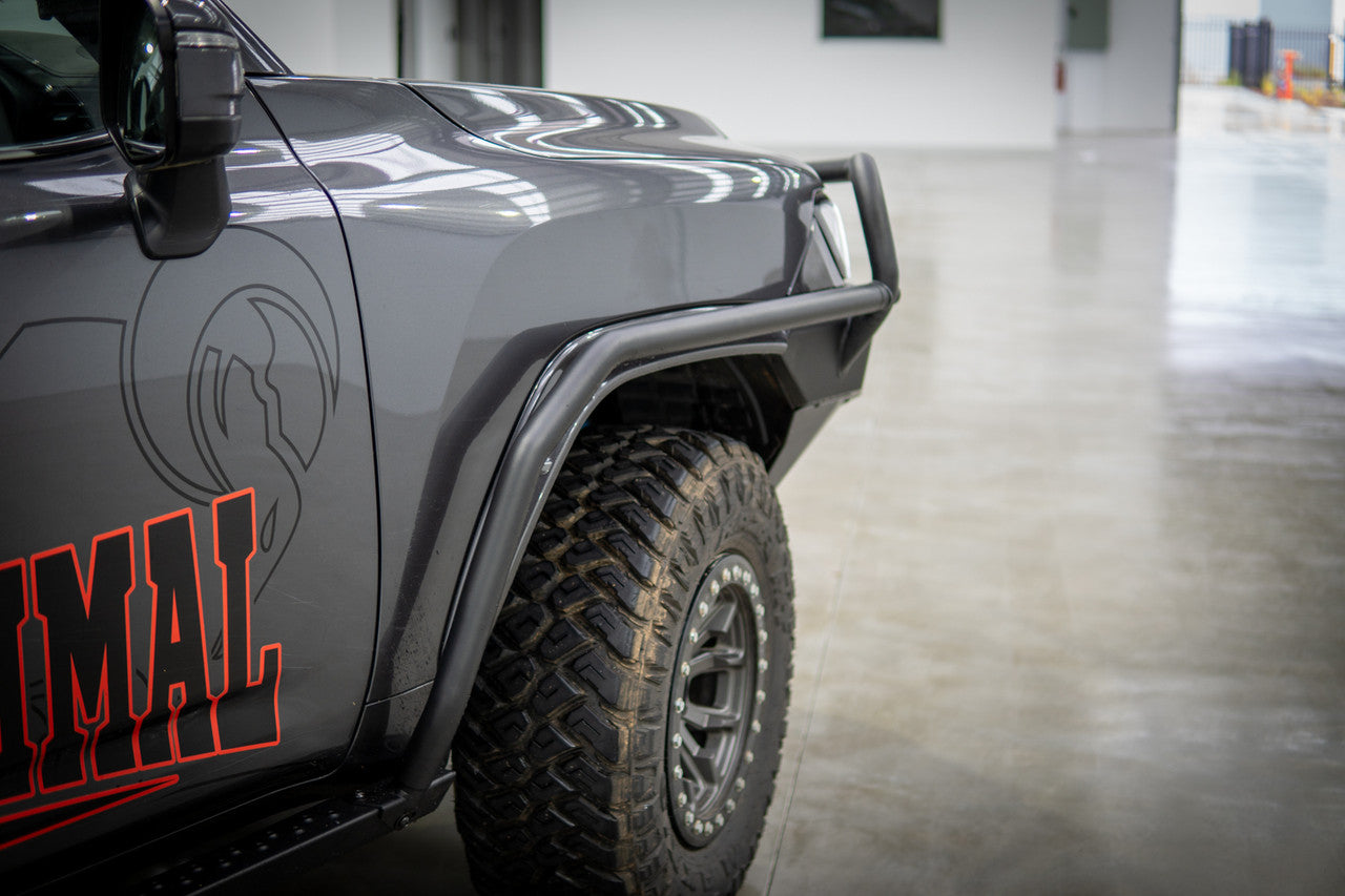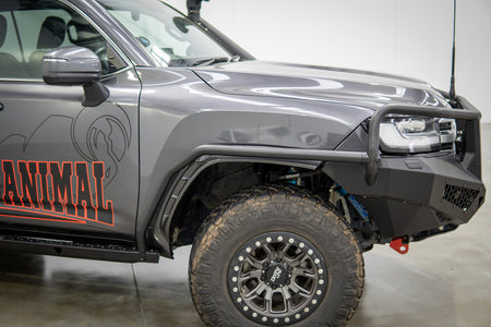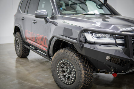 TheToyota Landcruiser 300 Seriesdoors and quarter panels are constructed from aluminum and may not withstand contact with rough objects like rocks and trees. Why not shield them with durable steel brush rails and rock slider steps from Offroad Animal?