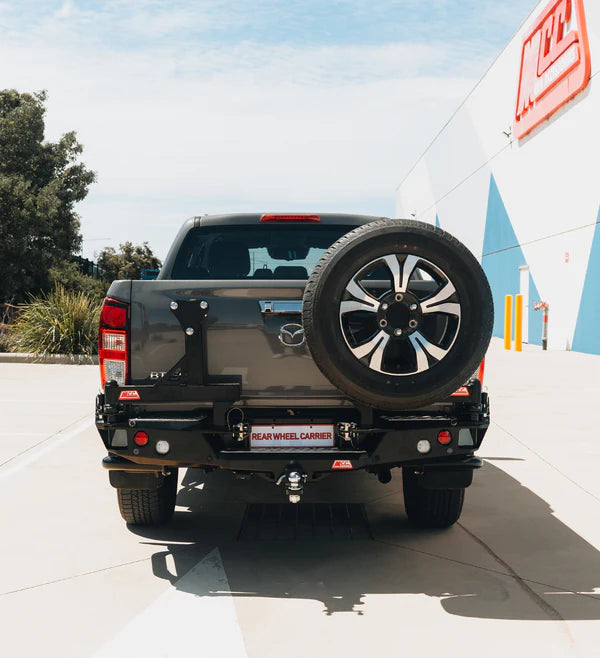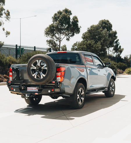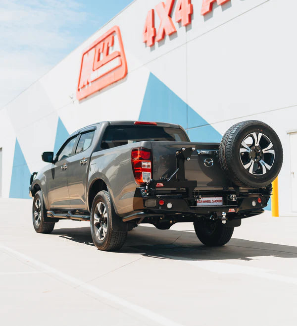 Get your Mazda BT-50 (2021 on) equipped with the Dual Wheel Carrier Rear Bar and say goodbye to worries about protecting your vehicle. With removable carrier arms and space for two 35" tires, this upgrade is perfect for storing all your 4WD essentials. Never let your next adventure catch you off guard - this Dual Wheel carrier has got you covered!