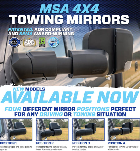 MSA 4X4 is proud to present our innovative and well-tested Electric Towing Mirrors. These high-quality mirrors are suitable for both towing and everyday driving, with a large single mirror that can be easily adjusted into four different positions.