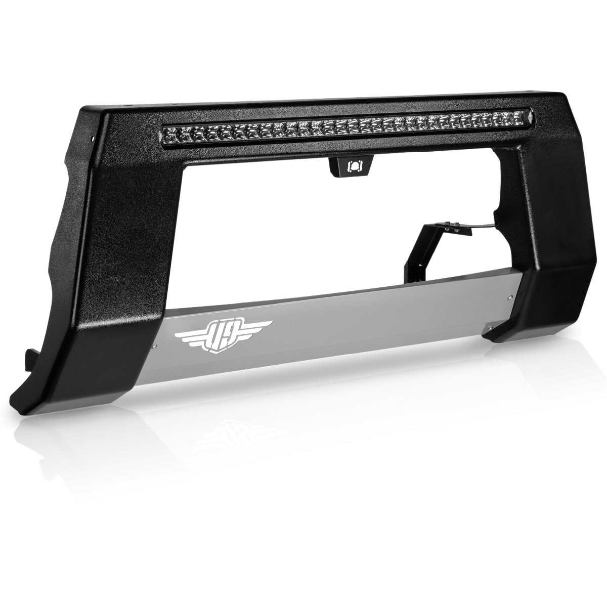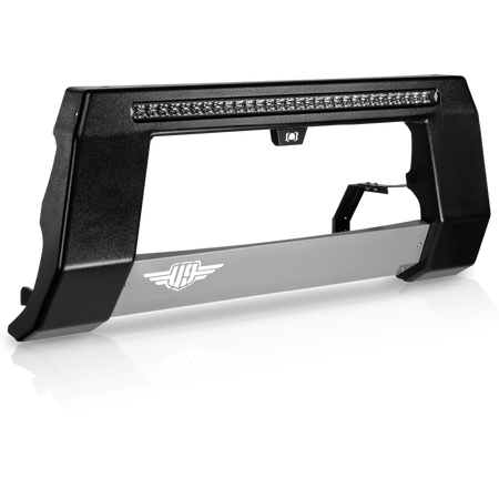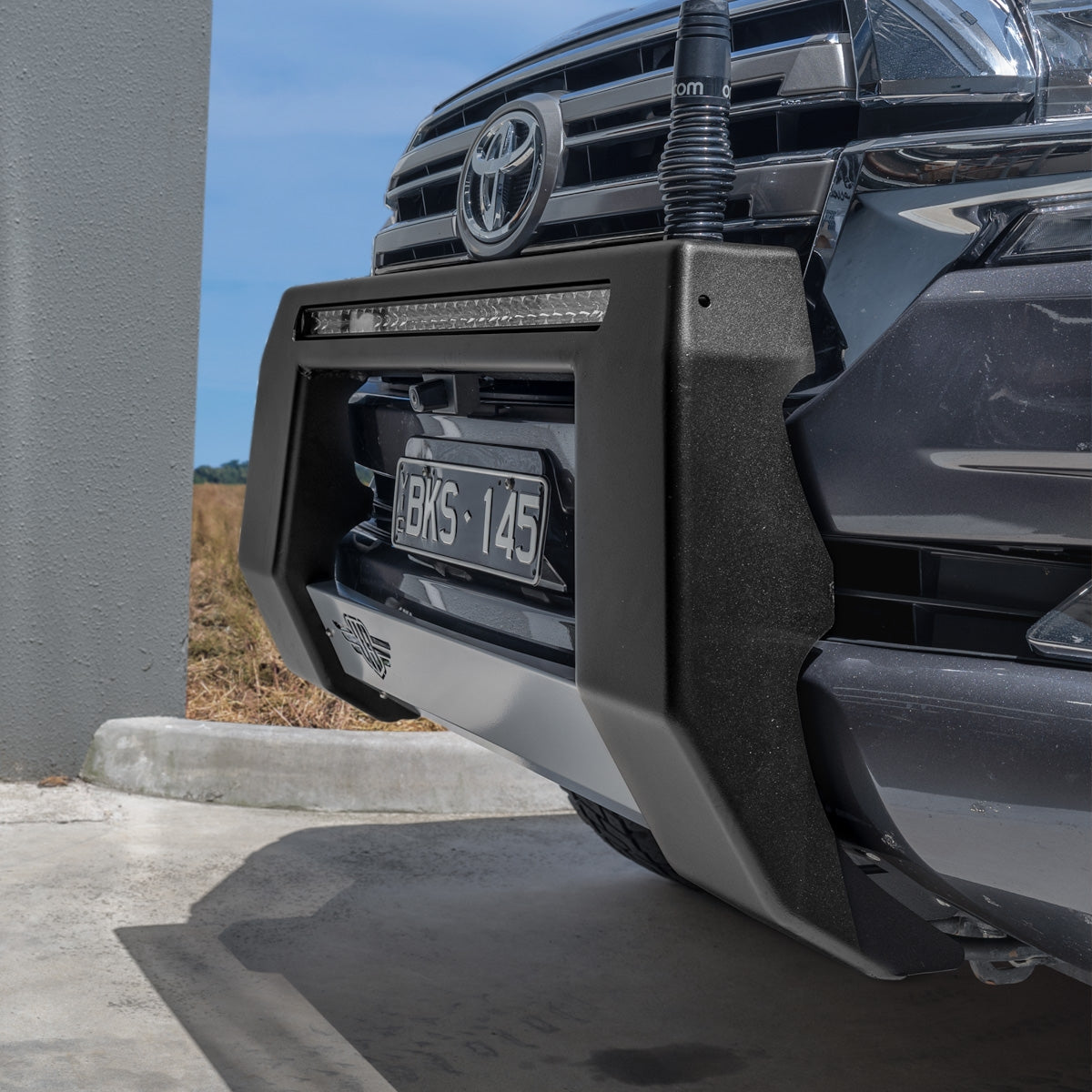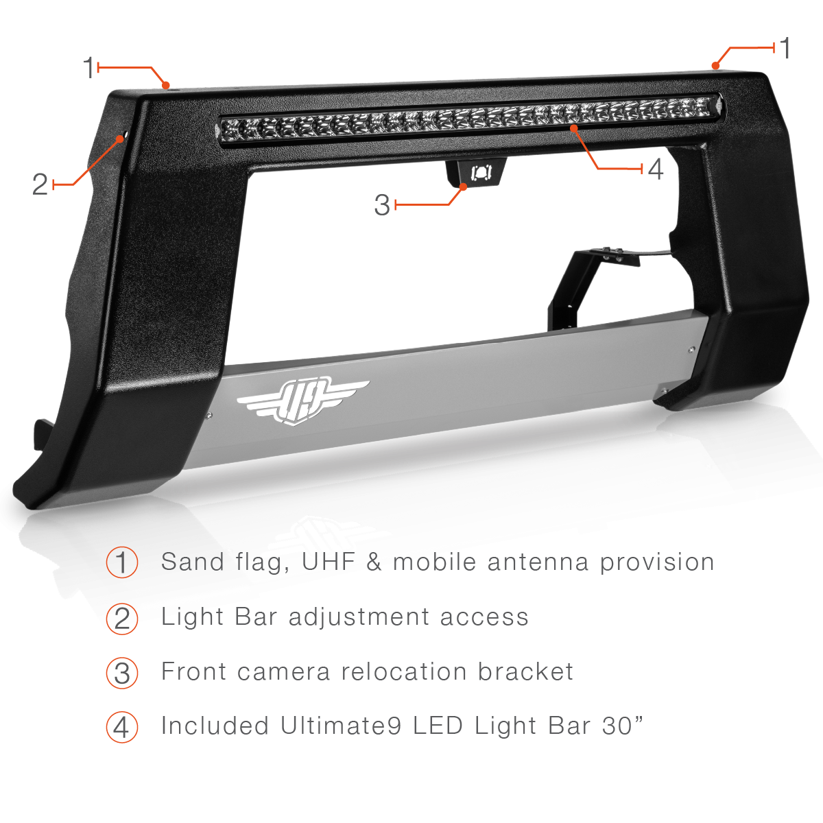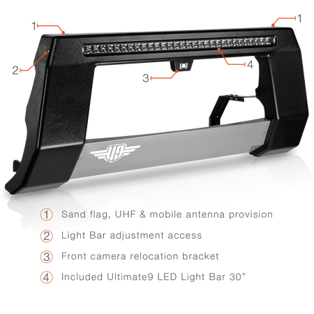 Made in Australia with durable 3mm steel, its low-profile, over-bumper design provides minimal forward projection while offering a mounting platform for UHF & mobile phone antennas, sand flags, and additional Ultimate9 LED Light Bars.